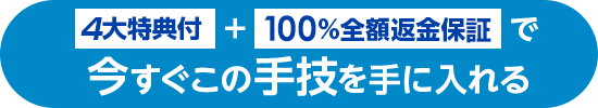そこで、お求めいただいたDVDの[全額返金満足保証]サービスを設けております。DVDをお手に取っていただき、今よりも技術的なスキルが上がらない、または実践したにも関わらず効果がみられないという場合でもご安心ください。