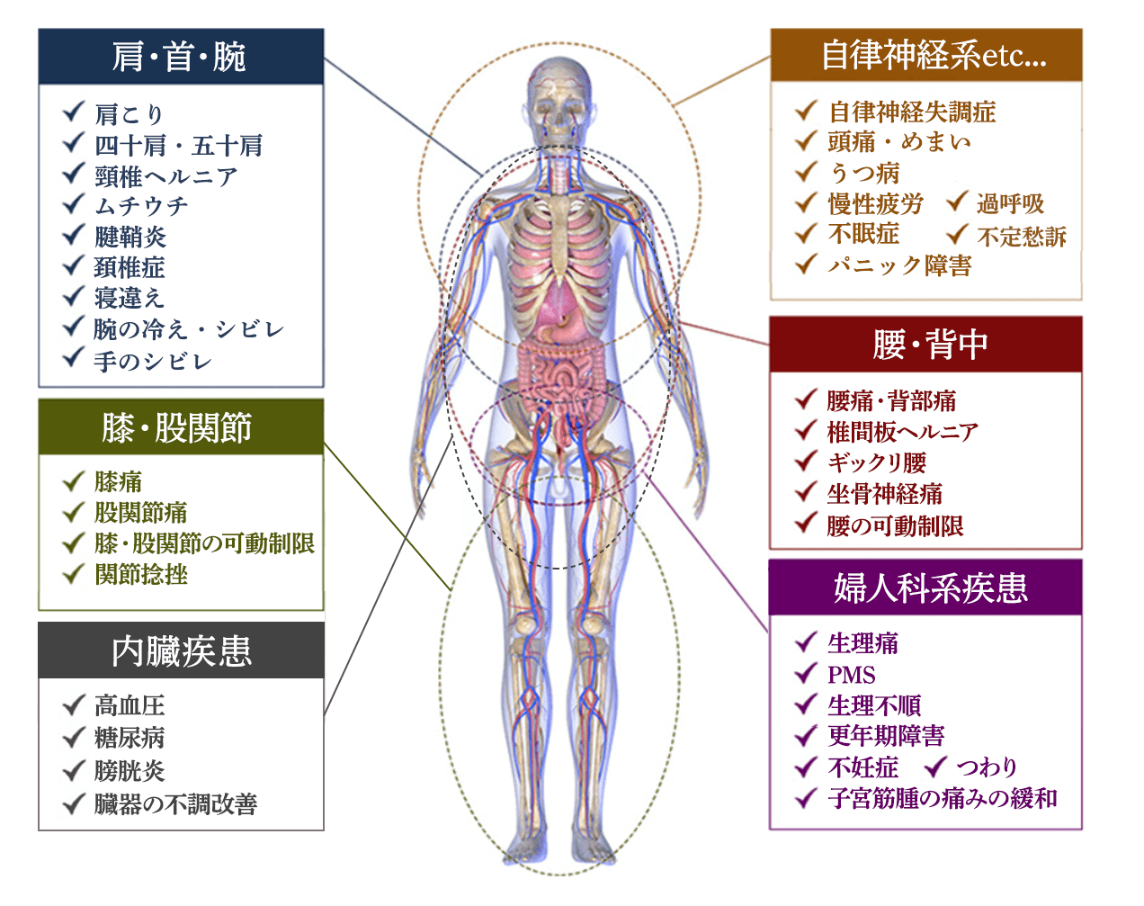 など、重度の痛みから、痺れ、自律神経の不調、内臓疾患、不妊症まで…