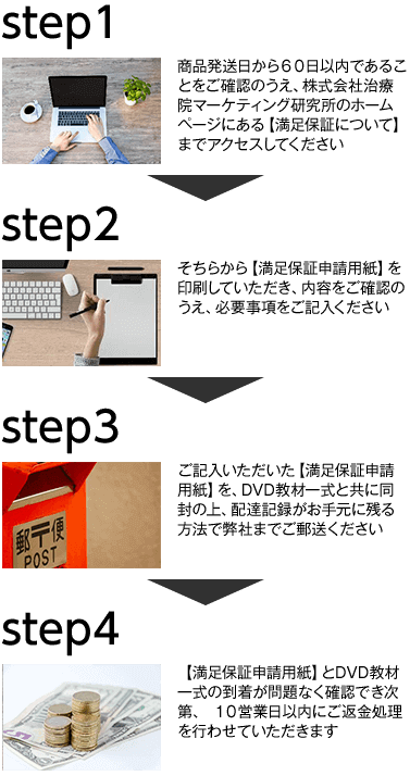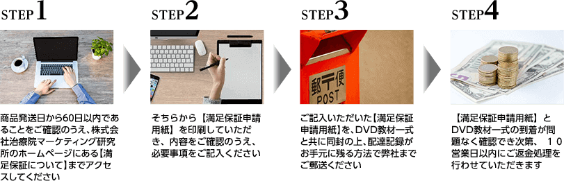 ※満足保証については、治療院マーケティング研究所のホームページの『満足保証について』のページ (https://t-marketing.jp/guarantee.html)にて詳細をご確認いただきお手続きをお願いいたします。 ※商品郵送時の送料はお客様のご負担になります。 ※商品価値を守るため、また販売できる個数が限定された商品を本当に必要なお客様に手に取っていただくために、商品の内容の如何に関連しない著しく悪質な理由による返品や、転売・特典目的による購入、返金ありきでの購入と判断できる方による返品に関しましては、保証対象外とさせていただきますのでご了承ください。 ※起算日は弊社からの商品発送日(配達票の伝票受付日)とし、起算日から60日以内に弊社必着である場合に限り保証の対象となります。