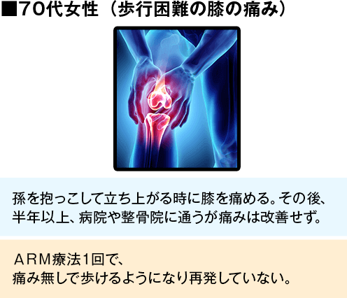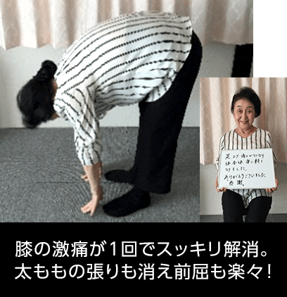 重度の膝痛があり、曲げようにも痛みで曲げられず、痛みと可動域制限で歩くのも危ない状態でした。
